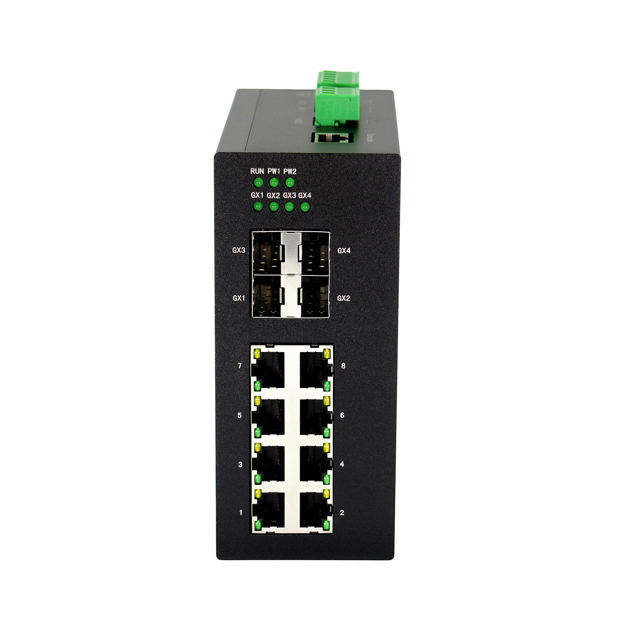Domestically produced Layer 2 industrial switch, featuring 8 Gigabit Ethernet ports and 4 Gigabit fiber SFP ports. Mountable on a rack, designed to operate in temperatures ranging from -40°C to +75°C. Equipped with dual redundant power supplies, requiring a DC voltage of 18–36V. Supports VLANs, ring networks, and Layer 2 network management features.