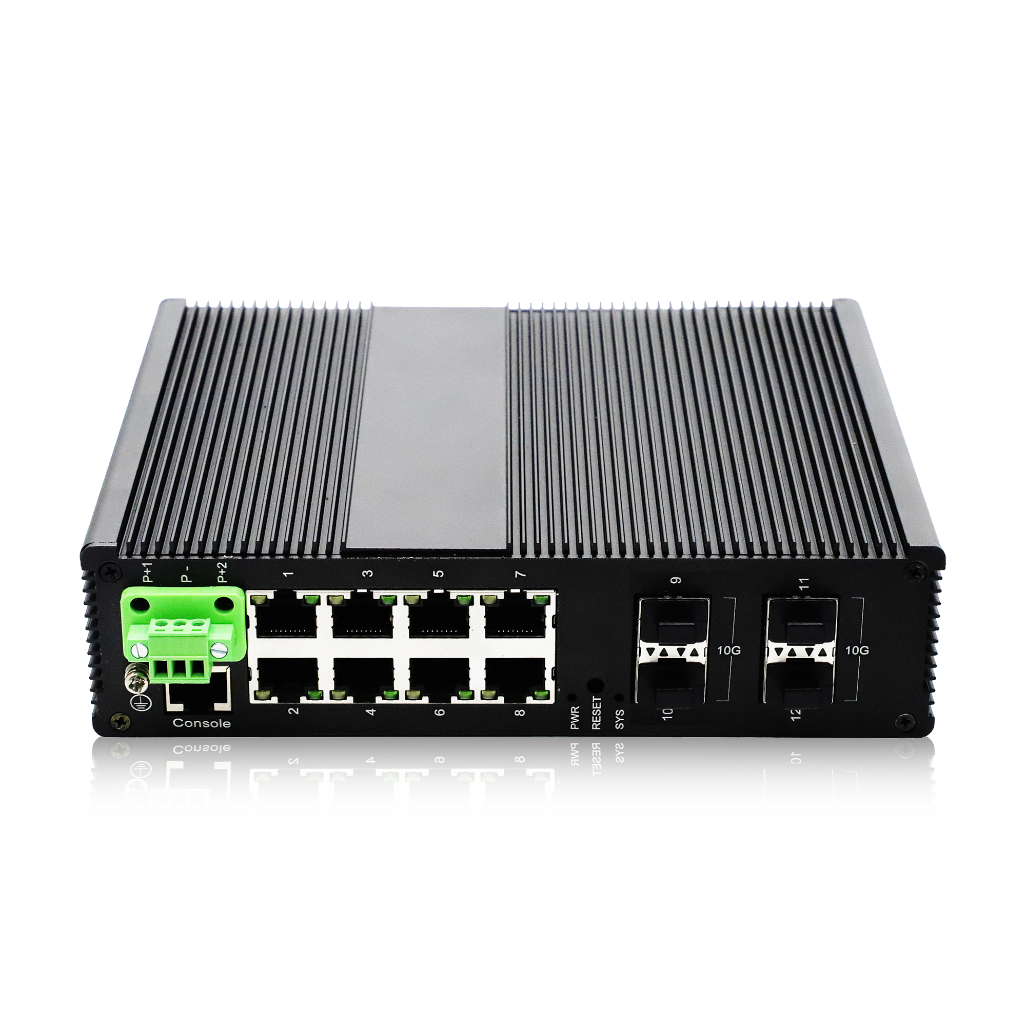 Industrial-grade Layer 2 network management device (aluminum alloy construction), featuring 8 Gigabit Ethernet ports and 4 Gigabit/10 Gigabit fiber SFP+ ports. Supports ring network topology, WEB/CLI management, SNMP protocol, as well as VLAN functionality; also supports static routing. Designed for industrial use, this device features a dual-power supply system with anti-reverse-plugging protection, enabling operation over a wide voltage range of DC10~55V. It has an IP40 protection level and can operate in extreme temperatures of -40°C to 85°C. By default, it does not include an AC power adapter or SFP modules.