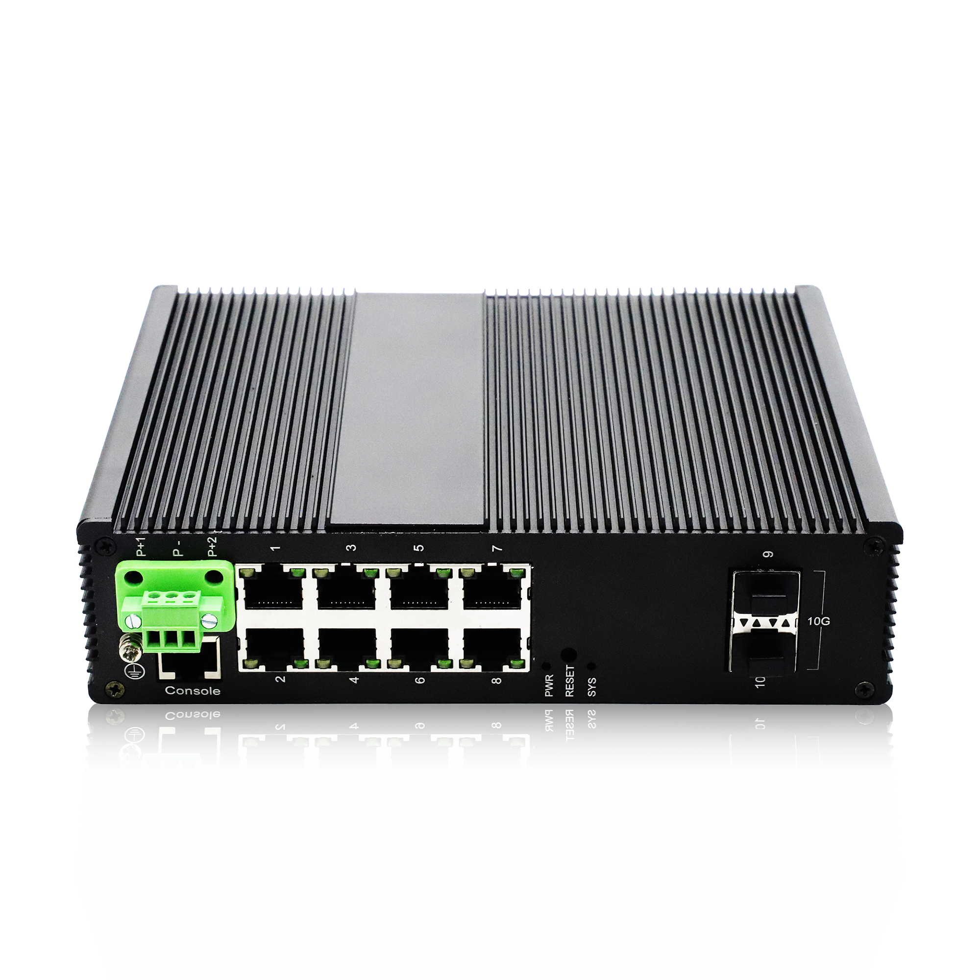 Industrial-grade Layer 2 network management device (aluminum alloy), featuring 8 Gigabit Ethernet ports and 2 Gigabit SFP fiber ports. Supports ring network topology, WEB/CLI management, SNMP, and VLAN functionality; also supports static routing. Designed for industrial use, this device features a rack-mounted design, dual-power supplies with anti-reverse connection protection, and a wide voltage input range of DC10~55V. It has an IP40 protection level and can operate in extreme temperature ranges of -40°C to 85°C. By default, it does not include an AC power adapter or SFP modules.